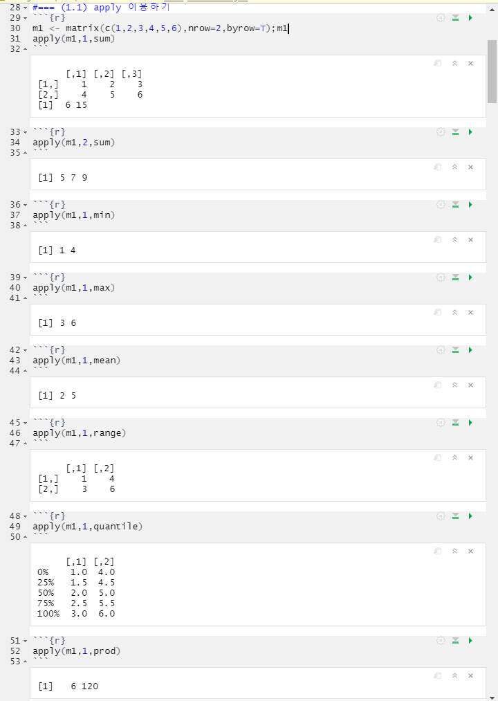 | m1 <- matrix(c(1,2,3,4,5,6),nrow=2,byrow=T);m1 # [,1] [,2] [,3] # [1,] 1 2 3 # [2,] 4 5 6 apply(m1,1,sum) # 행합계 apply(m1,2,sum) # 열합계 apply(m1,1,min) apply(m1,1,max) apply(m1,1,mean) apply(m1,1,range) apply(m1,1,quantile) apply(m1,1,prod) |