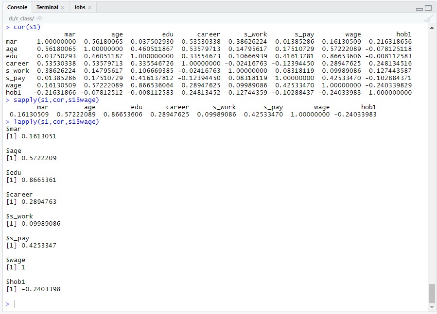 cor(s1) # 데이터 s1에 있는 모든 변수의 상관계수를 구합니다.(id와 gender를 제외했으니 가능) lapply(s1,cor,s1$wage) |