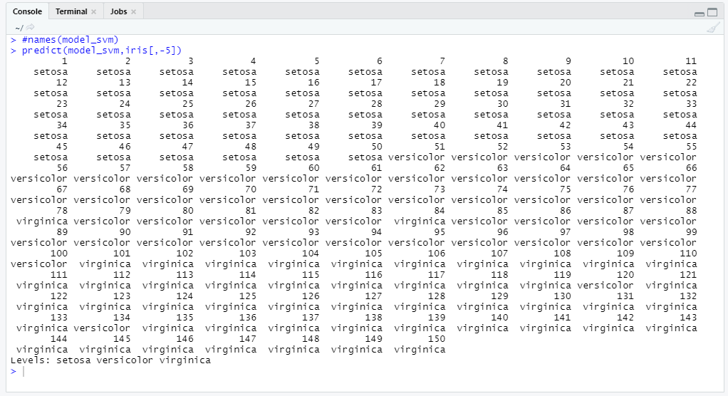 predict(model_svm,iris[,-5]) # iris[,-5] 는 iris 데이터 중에서 5번째 붓꽃의 종류 변수(SPecies)제외