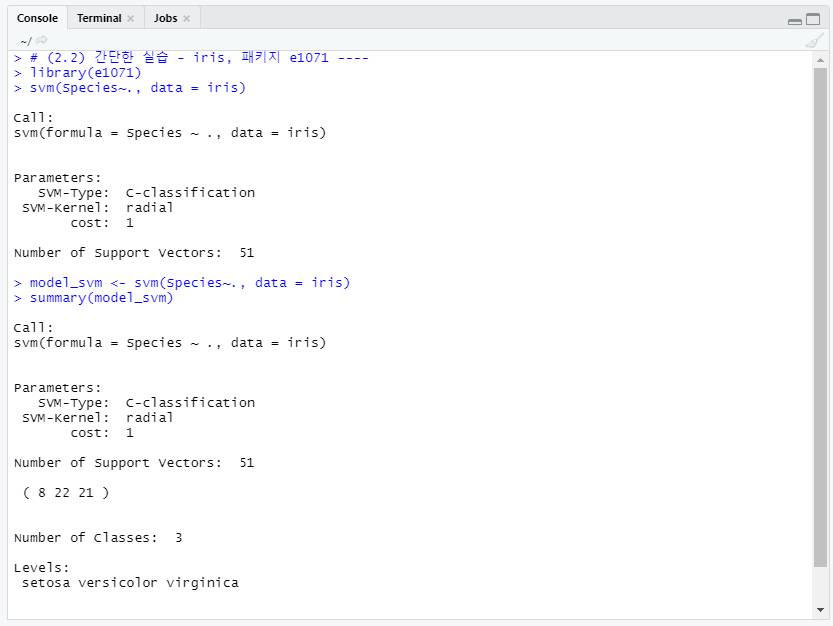 사용되는 데이터는 유명한 붓꽃데이타 iris 이고, 패키지는 e1071입니다.