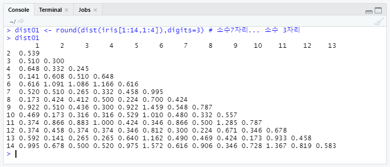 dist01 <- round(dist(iris[1:14,1:4]),digits=3) # 소수7자리... 소수 3 자리