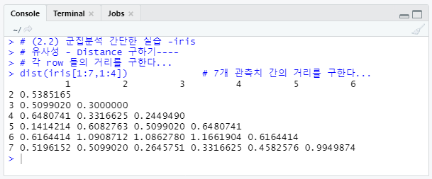 dist(iris[1:7,1:4]) # 7개 관측치 간의 거리를 구한다...