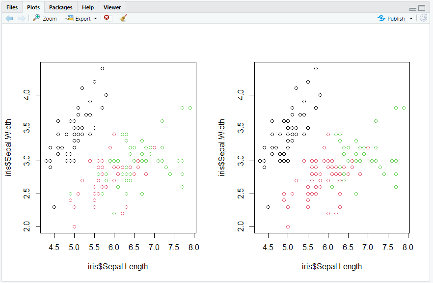 plot(iris$Sepal.Length,iris$Sepal.Width,col=iris$Species)