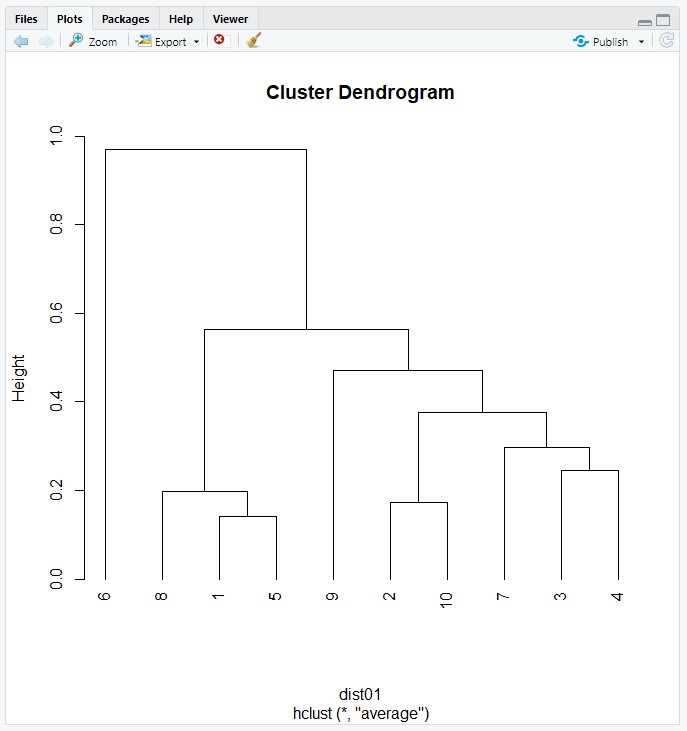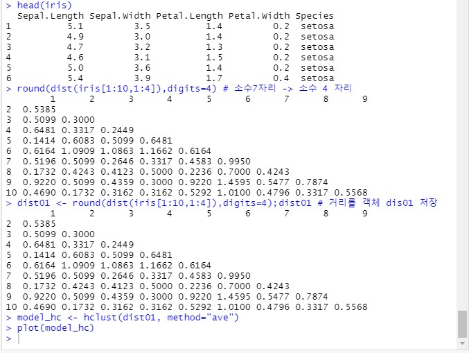 dist01 <- round(dist(iris[1:10,1:4]),digits=4);dist01 # 거리를 객체 dis01 저장