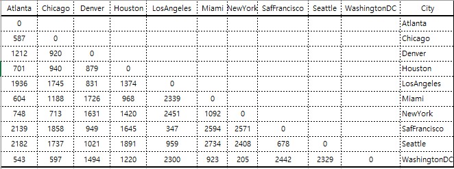다음은 SAS 메뉴얼에 나와 있는 미국 10개 도시간의 비행거리의 예입니다.